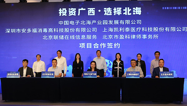 在北海市委書記蔡錦軍,市委常委、常務(wù)副市長(zhǎng)譚秀洪,市委常委、秘書長(zhǎng)鄭定雄,經(jīng)開區(qū)管委會(huì)主任劉忠廣,中國(guó)電子北海產(chǎn)業(yè)園公司執(zhí)行董事徐俊男,長(zhǎng)江商學(xué)院老師徐汀、長(zhǎng)江商學(xué)院老師許耀公的見證下,中國(guó)電子北海產(chǎn)業(yè)園發(fā)展有限公司與上海凱利泰醫(yī)療科技股份有限公司、北京聯(lián)儲(chǔ)在線信息服務(wù)有限公司、深圳市安多福消毒高科技股份有限公司、北京市盈科律師事務(wù)所簽署合作協(xié)議。